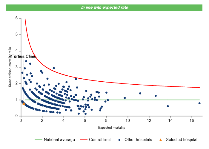 The vertical axis figures are presented as a standardised mortality ratio. This means the values do not represent percentages of patients who have died, but they represent the proportion of deaths compared to the national average. The data is also ‘risk adjusted’ to take account of the fact that different hospitals may operate on more higher-risk or lower-risk patients e.g. because of demographics in the patient population they work with.