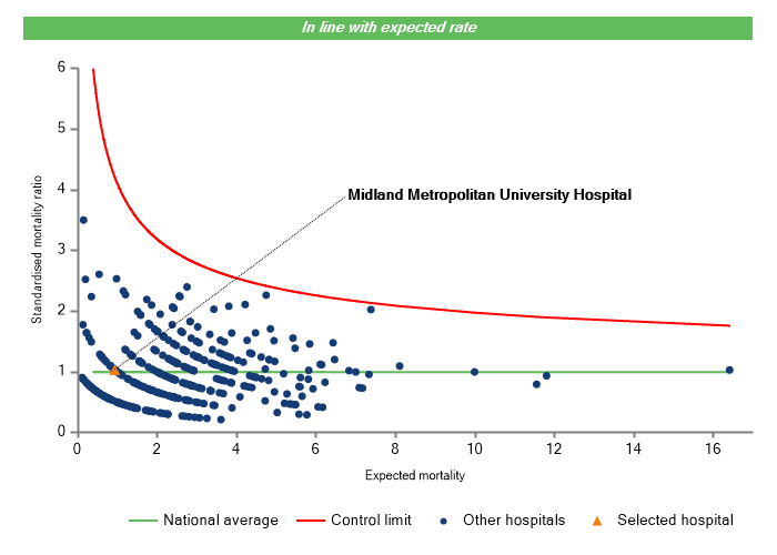 The vertical axis figures are presented as a standardised mortality ratio. This means the values do not represent percentages of patients who have died, but they represent the proportion of deaths compared to the national average. The data is also ‘risk adjusted’ to take account of the fact that different hospitals may operate on more higher-risk or lower-risk patients e.g. because of demographics in the patient population they work with.