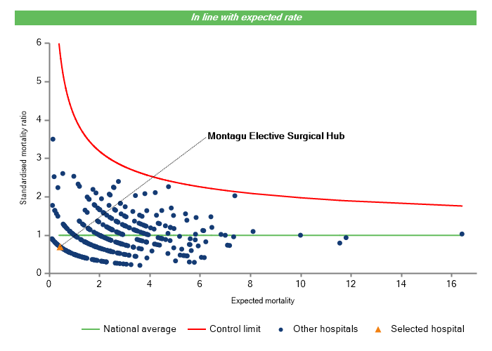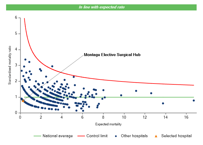 It is important to note that the types of patients a hospital treats and the procedures it carries out can explain variation in patient outcomes after surgery. Please click on the “How to interpret this chart” button for further information.