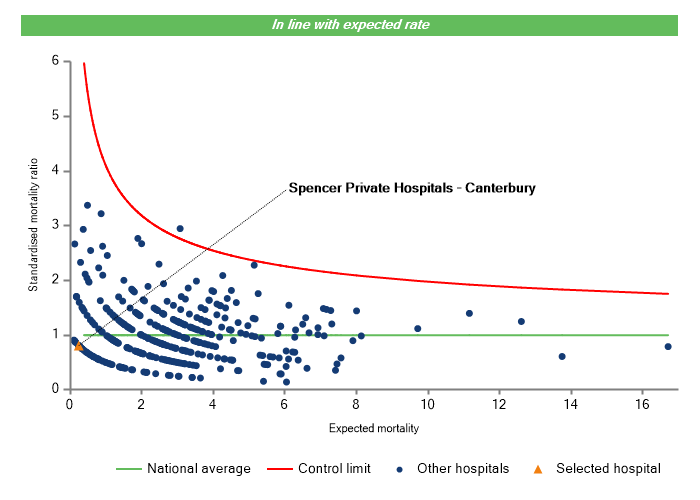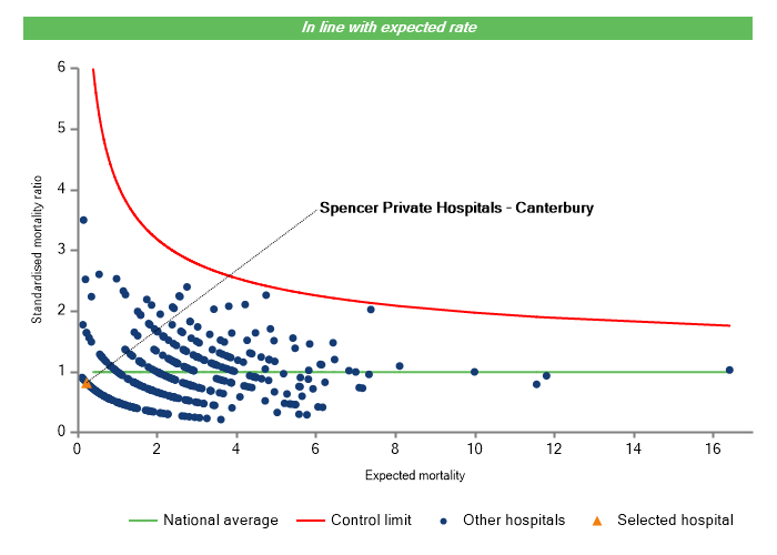 The vertical axis figures are presented as a standardised mortality ratio. This means the values do not represent percentages of patients who have died, but they represent the proportion of deaths compared to the national average. The data is also ‘risk adjusted’ to take account of the fact that different hospitals may operate on more higher-risk or lower-risk patients e.g. because of demographics in the patient population they work with.