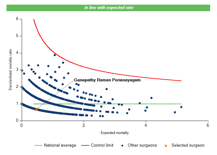 The vertical axis figures are presented as a standardised mortality ratio. This means the values do not represent percentages of patients who have died, but they represent the proportion of deaths compared to the national average. The data is also risk adjusted to take account of the fact that different surgeons may operate on more higher-risk or lower-risk patients e.g. because of demographics in the patient population they work with.