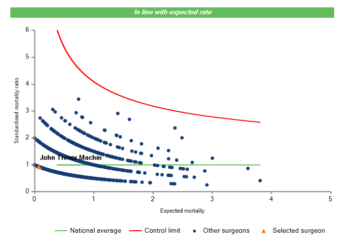 The vertical axis figures are presented as a standardised mortality ratio. This means the values do not represent percentages of patients who have died, but they represent the proportion of deaths compared to the national average. The data is also risk adjusted to take account of the fact that different surgeons may operate on more higher-risk or lower-risk patients e.g. because of demographics in the patient population they work with.
