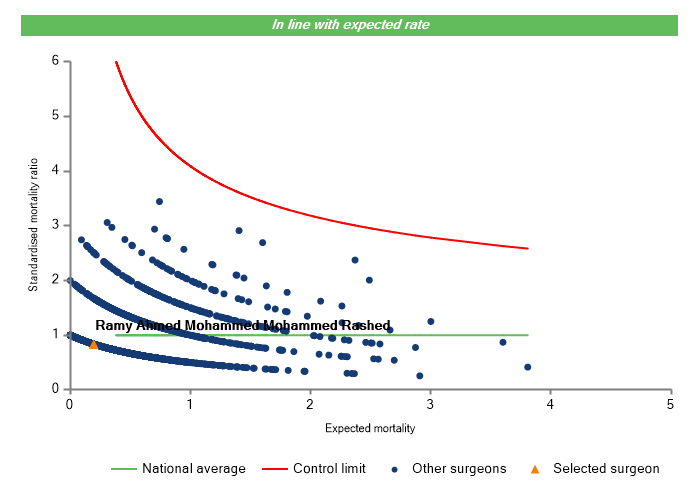 The vertical axis figures are presented as a standardised mortality ratio. This means the values do not represent percentages of patients who have died, but they represent the proportion of deaths compared to the national average. The data is also risk adjusted to take account of the fact that different surgeons may operate on more higher-risk or lower-risk patients e.g. because of demographics in the patient population they work with.